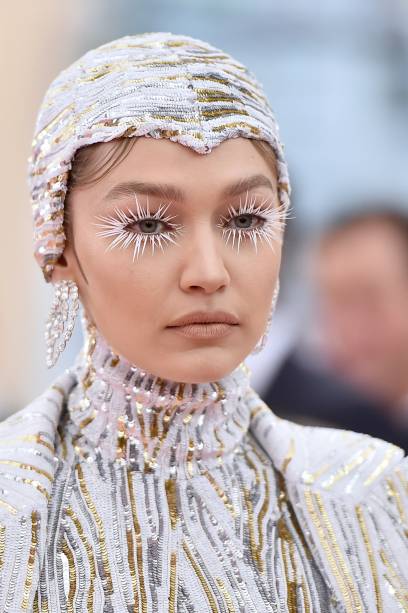 Mas, mais do que usar “só” o vestuário como forma de expressão, muitas celebridades apostaram também em maquiagens e penteados icônicos, que traduziam perfeitamente o conceito ‘Camp’. Entre as maiores tendências de beleza encontradas no red carpet do Met destacamos os cílios gigantescos, aposta de Lady Gaga, Gigi Hadid e Priyanka Chopra, e os cabelos coloridos, como os de Lucy Boynton e Kylie Jenner, a maioria deles respeitando a paleta pastel.