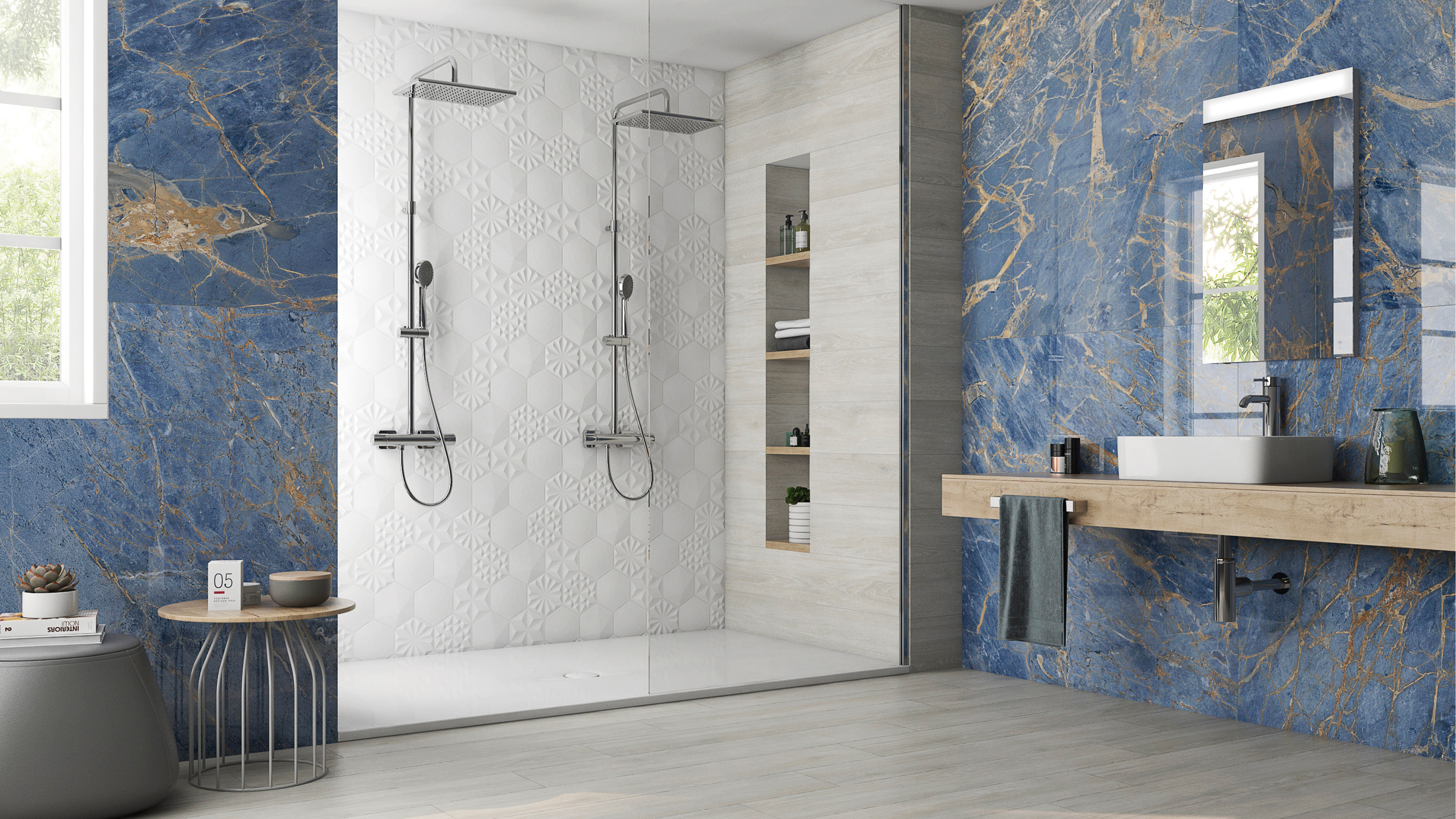 Utilizada no banheiro acima, a linha de porcelanato Marble Nouveau, da Roca Cerámica, combina tonalidades de azul com sobreposição de veios que vão do nude ao ouro. Por ser translúcido, o revestimento de ônix ornamental permitiu uma criação ousada do arquiteto Maurício Karam: ele posicionou focos de luz por trás da pedra, transformando a parede do lavabo em uma luminária.