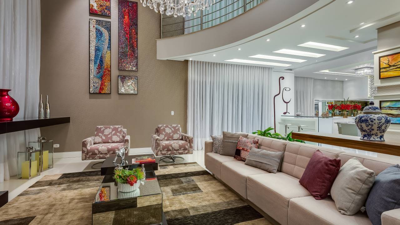 Com amplas circulações, o projeto de interiores desta casa com 600 metros quadrados, localizada em uma chácara em Araucária, Curitiba, privilegia a amplitude dos ambientes. Assinado pelo escritório Machado & Weiss, o projeto moderno valoriza a elegância, procurando usar elementos neutros e atemporais a fim de destacar detalhes mais pontuais na decoração.