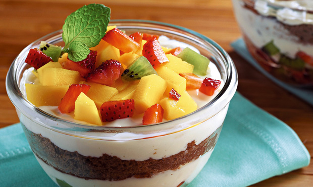 3. Em um refratário, coloque sucessivamente uma camada de creme, uma camada de pão-de-ló e uma camada de frutas.