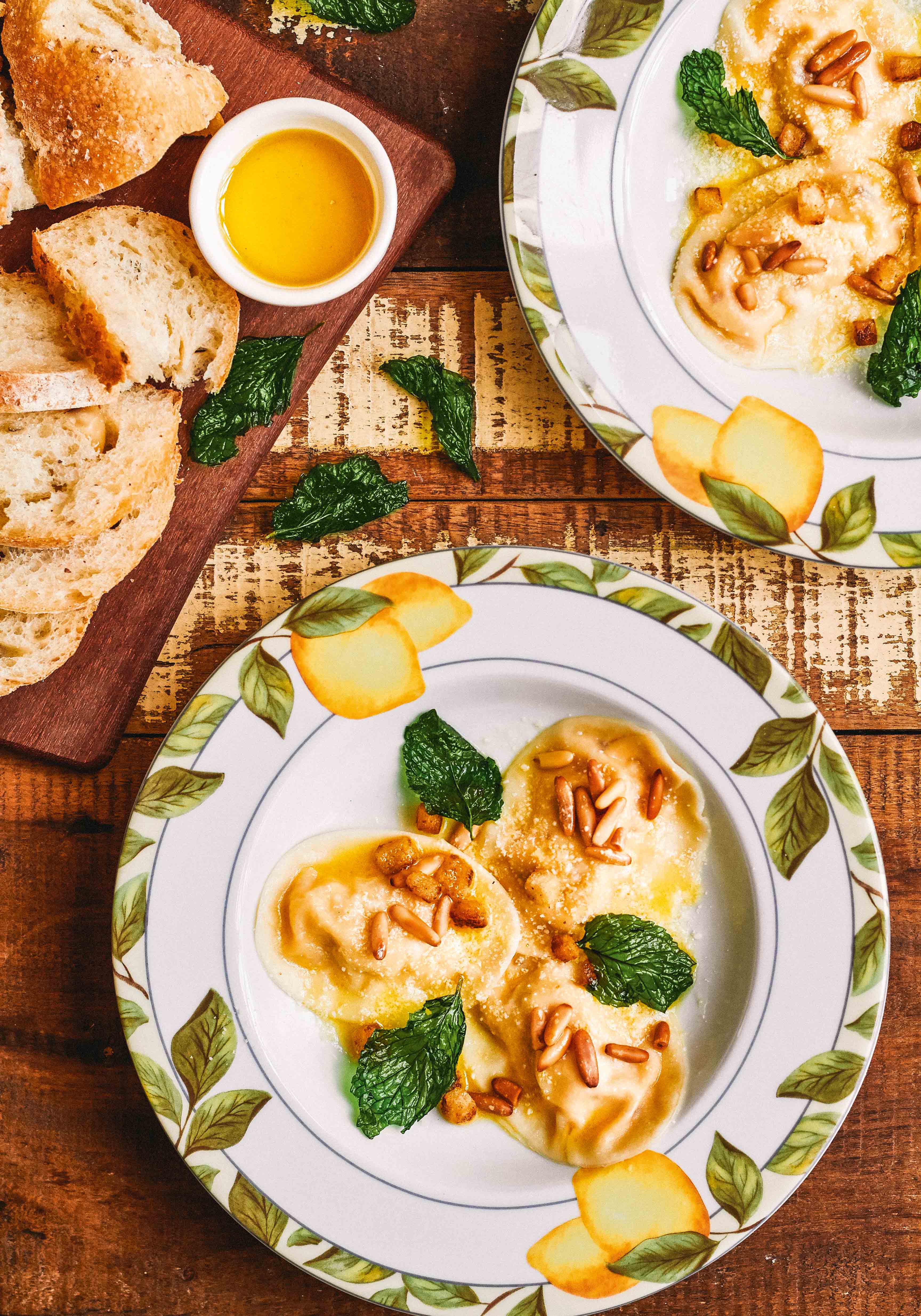 Em uma frigideira, em fogo médio, toste o pinoli e reserve. Em uma panela, frite a hortelã em óleo quente, em imersão, até ficar crocante. Deixe escorrer em papel absorvente. Em uma panela, leve o suco de limão ao fogo médio até reduzi-lo a 1/4. Junte a manteiga e o azeite e bata com um fouet para emulsionar. Tempere com sal. Reserve. Em uma panela com água fervente e sal, cozinhe a massa por dois minutos. Escorra. Sirva com o molho, dispondo por cima o queijo restante, o pinoli, a hortelã e o croûton.