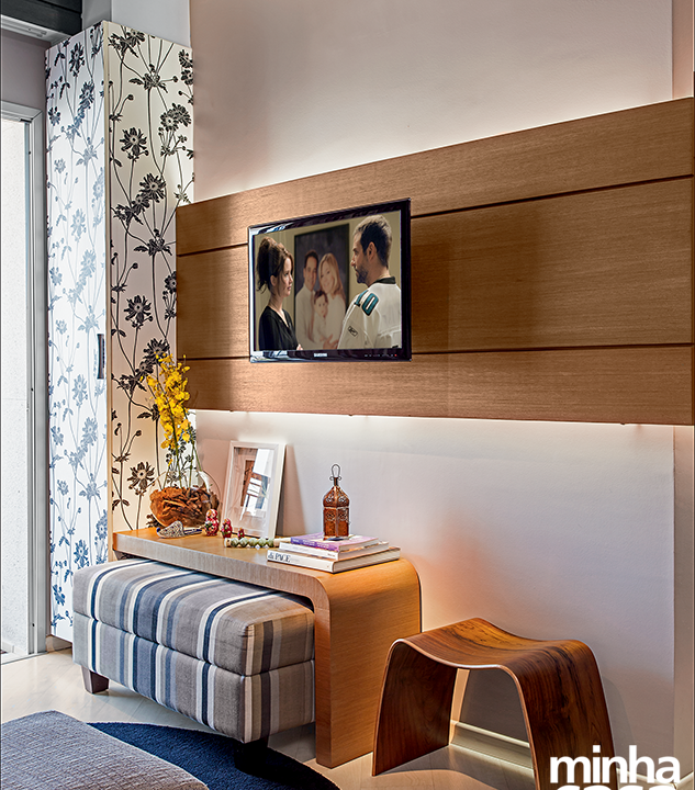 De MDF revestido com lâmina de madeira no padrão Teak 253, da Rume. Projeto da designer de interiores Elvira Monteiro.