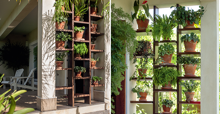 ❚ Com 1,20 x 0,18 x 2,29 m*, a peça é composta de três partes com cinco prateleiras cada. a largura entre as colunas é a mesma (37 cm), mas a altura dos nichos varia para acomodar diferentes tamanhos de planta.