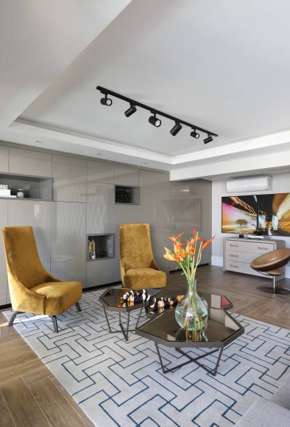 Todo o projeto foi pensado para criar um ambiente amplo onde tudo tivesse sua função e houvesse harmonia. O espaço dedicado à sala foi pensado para que fosse dividido por dois sofás, separando o ambiente e, ao mesmo tempo, atendendo aos dois lados da sala (o estar íntimo e a sala de TV).