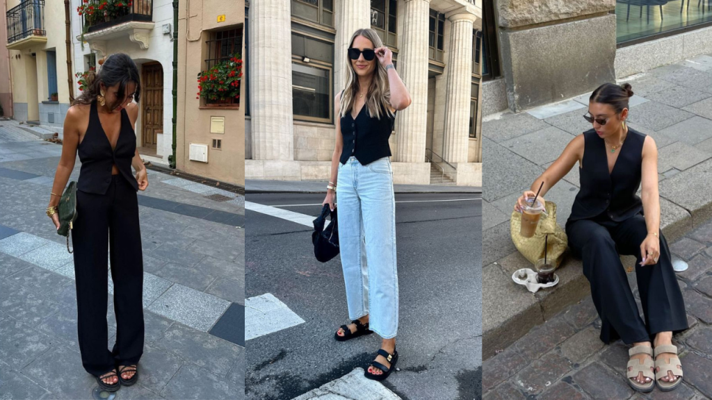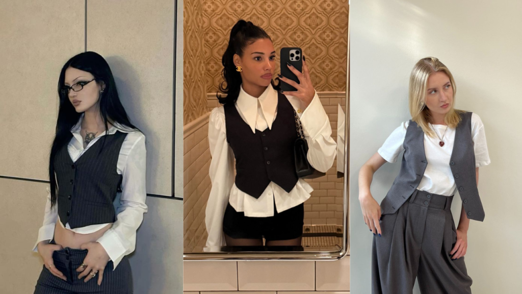 O colete de alfaiataria está em alta, impulsionado pela tendência office siren que valoriza o estilo de mulheres em ambiente de escritório. Ao considerar usá-lo sozinho, avalie se o seu local de trabalho permite, pois ele pode conferir um toque mais sensual ao look. Para uma combinação elegante, experimente com uma parte de baixo no mesmo tecido.
