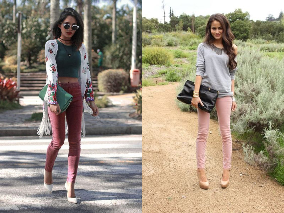 Quem disse que toda calça precisa ser azul? As peças nos tons rosês variam no resultado e podem deixar o look mais descolados – se combinadas com um cropped em tons escuros, como o verde – e até mesmo mais elegantes – se combinada com uma blusa de ombro vazado.
