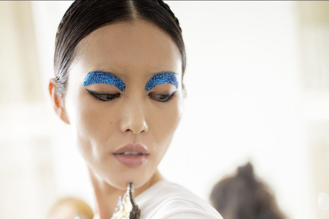 Durante o desfile de alta-costura inverno 2019/2020 da grife Valentino, o destaque foi a sobrancelha de glitter. Ela é a grande aposta da top maquiadora Pat McGrath para a próxima temporada.