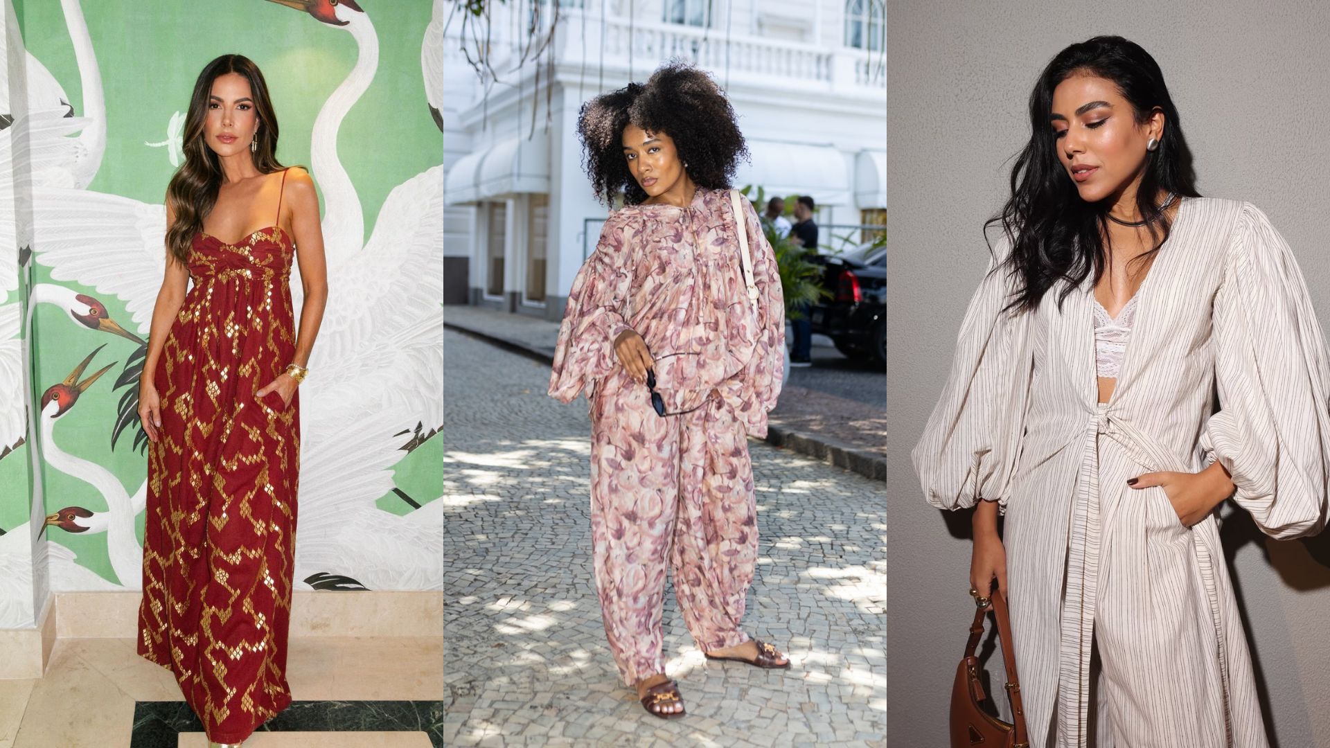 Para um efeito moderno, vale apostar em tecidos leves e fluídos, como crepe e seda, que garantem um caimento impecável. Durante o dia, combine com acessórios minimalistas, como colares finos e brincos pequenos.